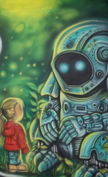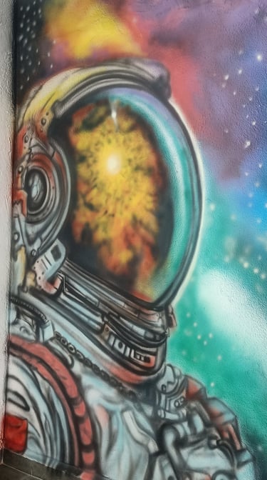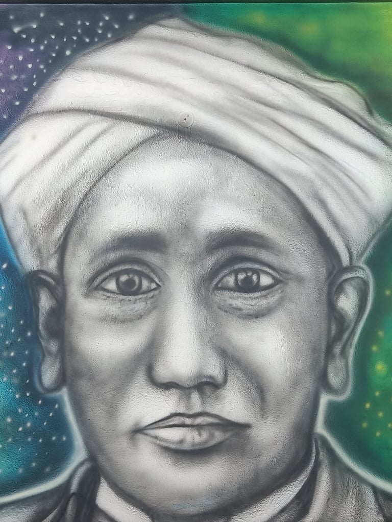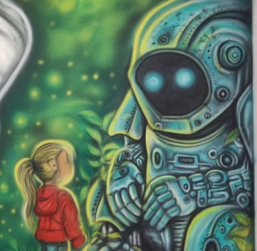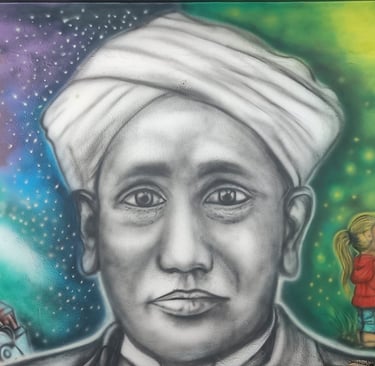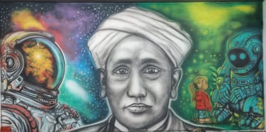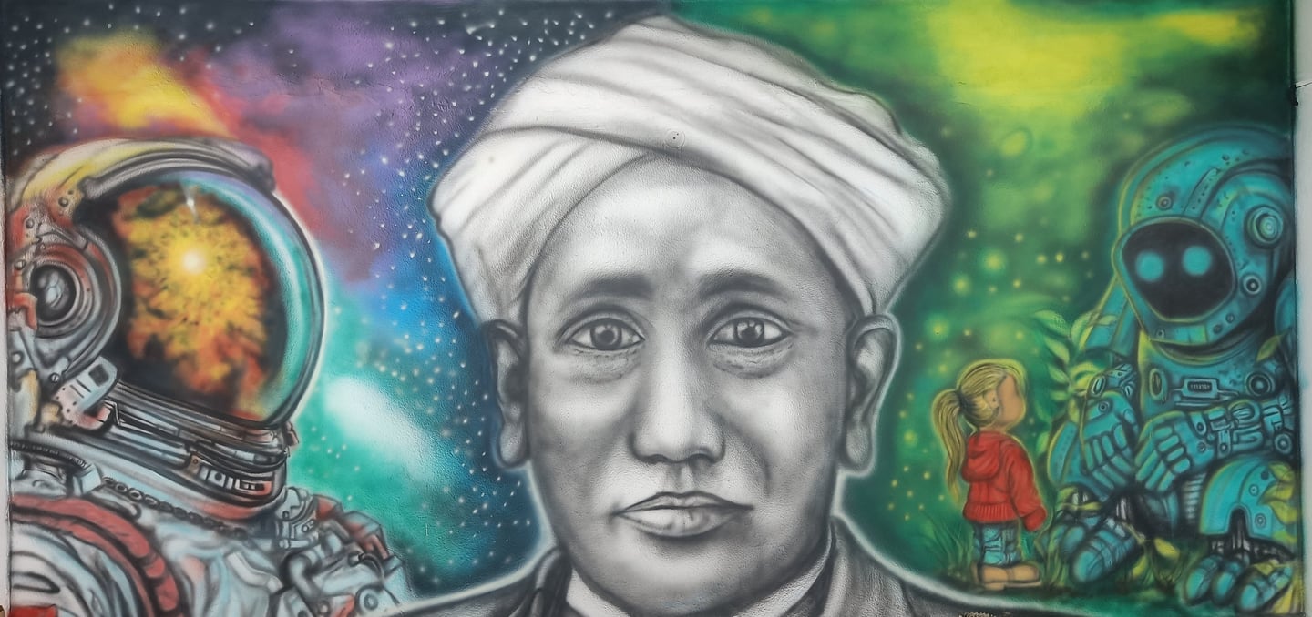 At the STEM Lab of this school, we brought science to life through a large-scale mural featuring C.V. Raman, an astronaut adrift in space, and a curious young girl engaging with a robot. The brief was simple yet profound — to ignite imagination and spark a lifelong fascination with science.
